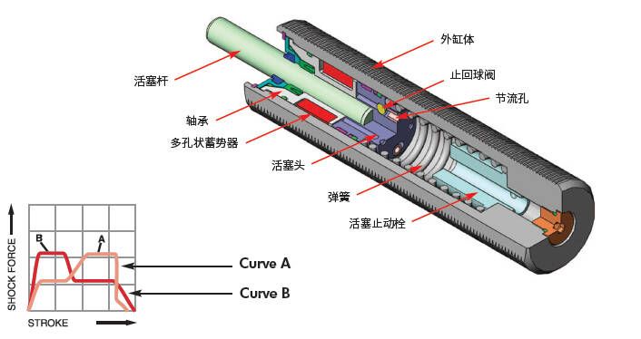 當活塞運動時,止回擋環抬起,油被沿著內缸壁上的節流 孔隨活塞進入密閉的多孔泡沫蓄勢器。隨著活塞的推動, 逐漸封鎖節流孔,因而節流孔面積相應減少,當負荷解除時,回應彈簧將活塞桿推向外邊,止回擋環開啟,油從蓄勢器經過活塞頭流回到內缸體,為后一次沖擊快速復位。